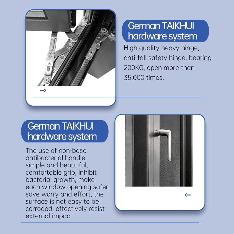 3層シーリング設計により超断熱、気密性を強化し、窓全体の性能を向上させます。ウィンドウにはドイツTaik Hui社の改良型ベースレス高精度ハンドルを採用し、人間工学に基づいて設計され、先進的で独特なホールド感をもたらします。 Taik Hui の頑丈なギア ヒンジ、落下防止安全ヒンジ、耐荷重 200KG、35,000 回以上開くことができ、窓の耐用年数を保証します。窓サッシはコーナーコードで接続されており、より安全で安定しており、省エネで環境に優しいです。